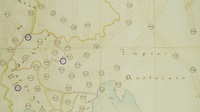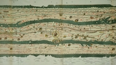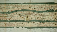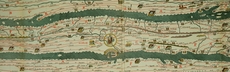 Historisches Faksimile der „Tabula Peutingeriana“, der fast sieben Meter langen mittelalterlichen Abschrift einer spätrömischen Straßenkarte (Detail)
