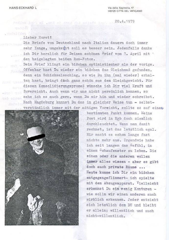 Hans-Eckhard L. aus Magdeburg genoss Ende der 1970er-Jahre das äußerst seltene Privileg, an einer päpstlichen Universität im Vatikan Kirchenrecht studieren zu dürfen. In den von dort versandten Briefen an seinen Brieffreund Horst H. in Stuttgart konnte er sich ungewohnt frei ausdrücken. Hans-Eckhard L. zeichnet in seinen Schilderungen ein farbiges Bild seines ungewöhnlichen Studienaufenthalts, warnt aber zugleich eindringlich davor, in Briefen in die DDR den Zweck seines Aufenthalts konkret zu benennen.